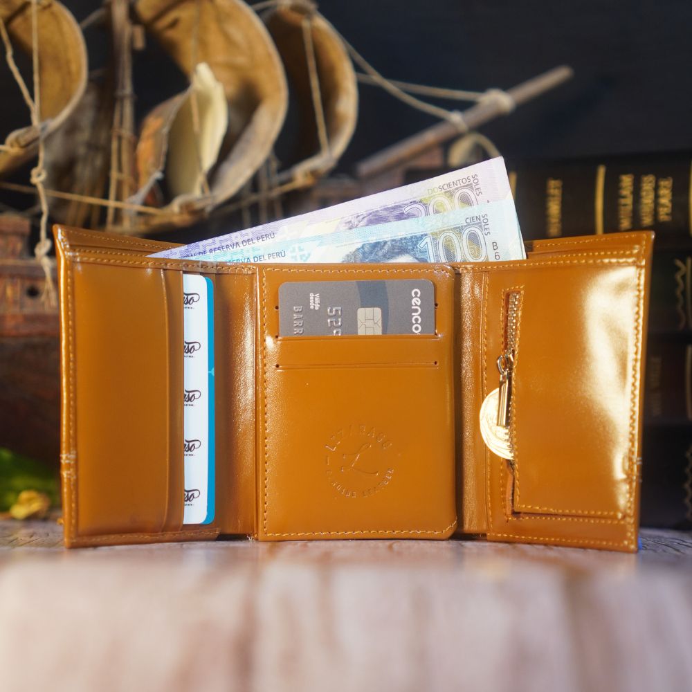- Compartimentos para tarjetas, documentos, billetes y monedas.